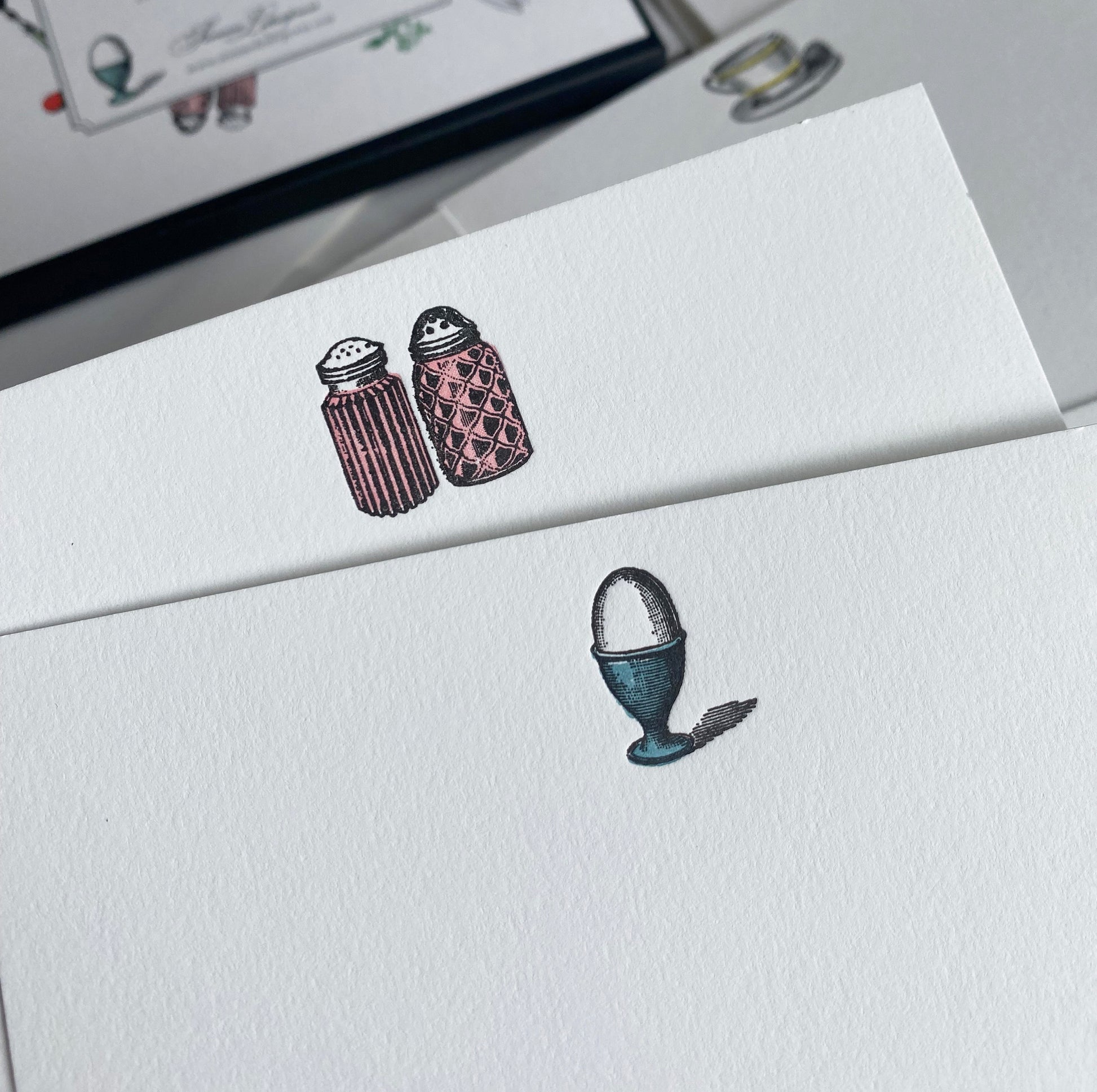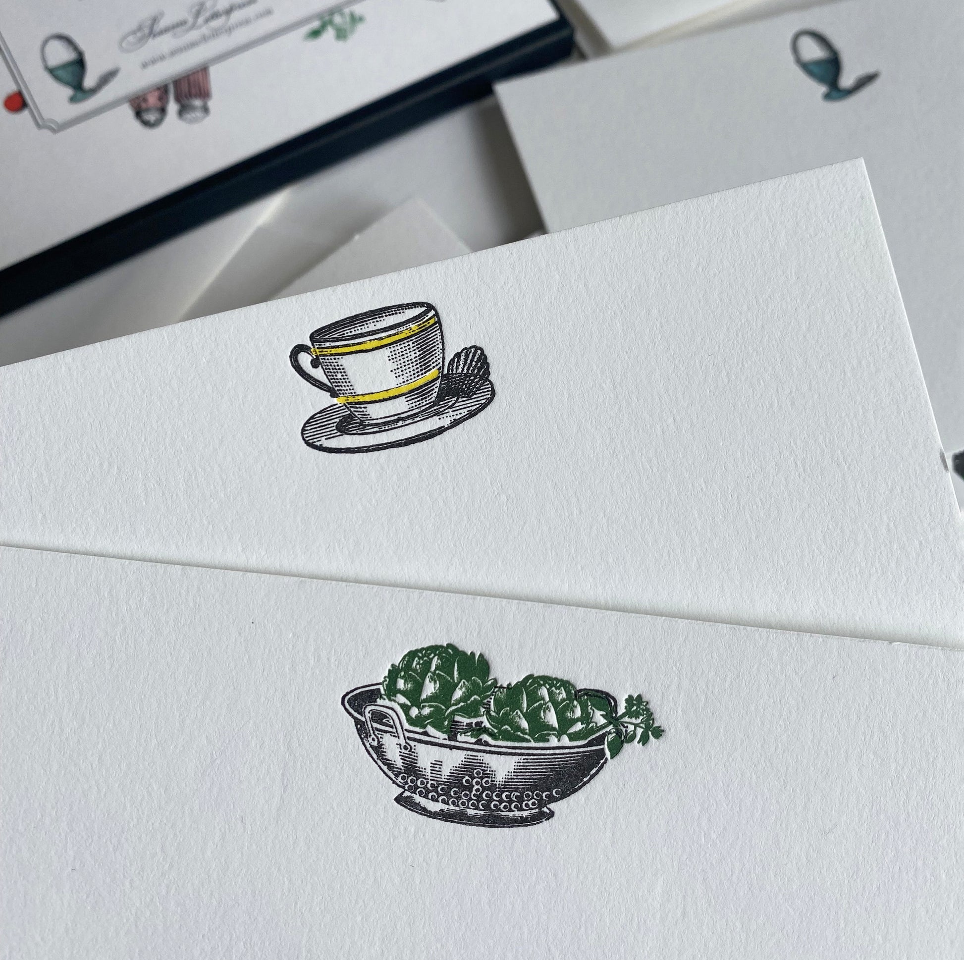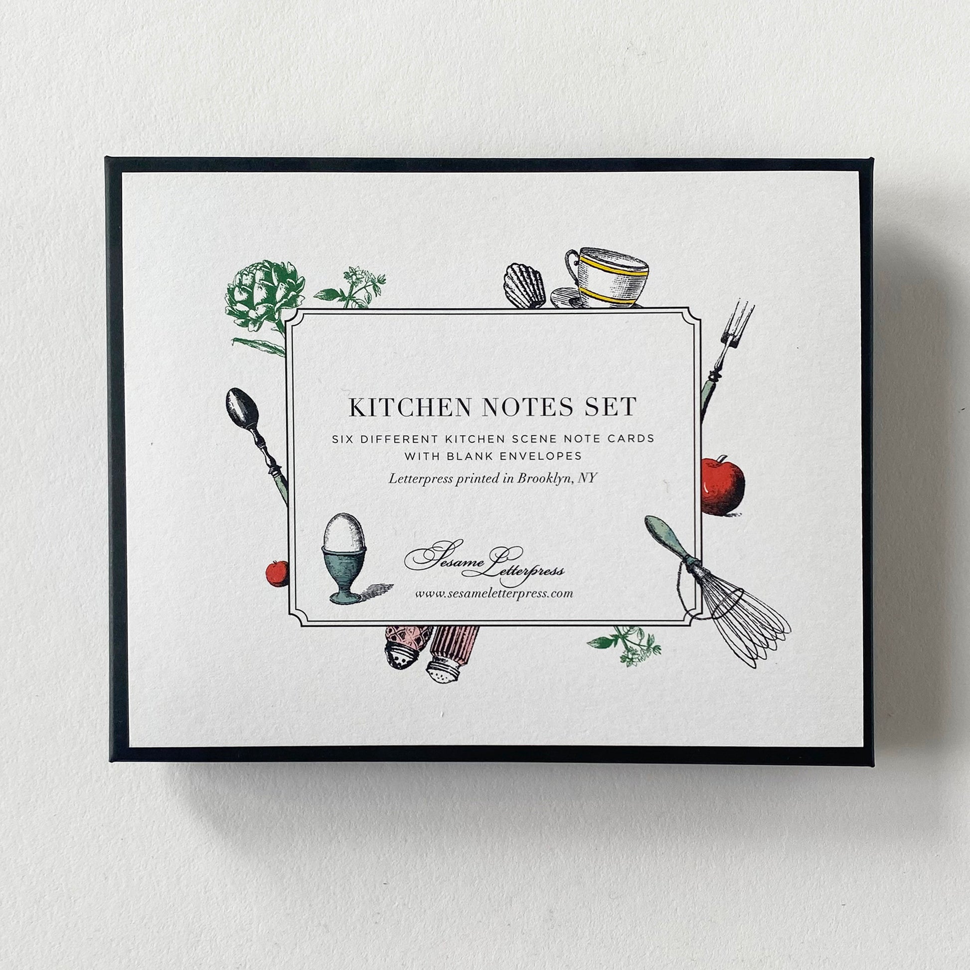 Boxed set of 6 A2 (4.375" x 5.75") sized note cards featuring letterpress printed kitchen scenes: a vintage whisk, colorful egg cup, salt & pepper shakers, apple tart baking, tea cup and artichokes with matching blank envelopes. Tree-free paper stock.