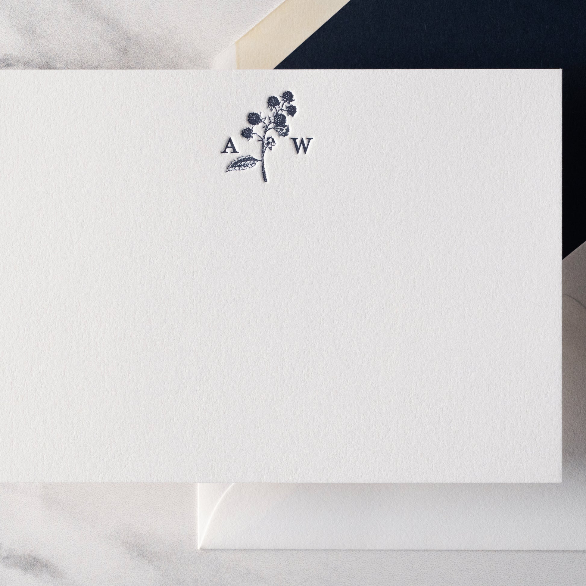 This letterpress note card design features an image of your choice with your initials printed with it.